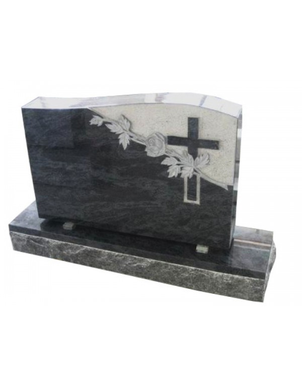 A superb granite in the bahamas blue color featuring a wreath of rose accompanied by a cross.