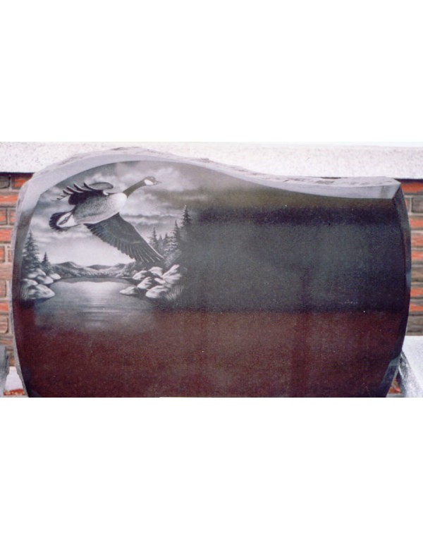 This funerary monument with non-traditional forms but a timeless classic, is offered here in black and polished color on each of its surfaces, leaving these rustic sides. A magnificent landscape of nature with a duck in full flight in the foreground.