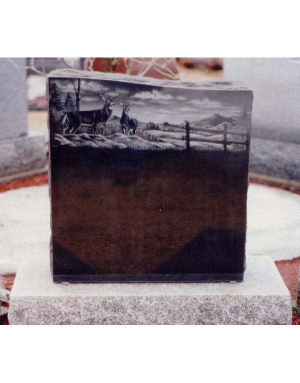 A monument carved out of premium black granite showcasing a magnificent natural landscape. Drawing done entirely by hand.