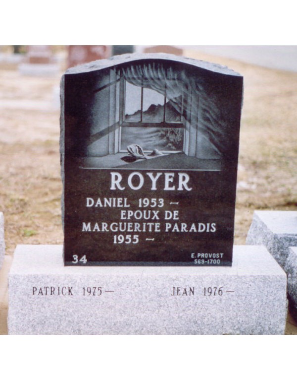This funerary monument of very classic shape, is offered in a magnificent black color, its finish is polished on the front and rustic on the sides. The engraving with the chisel of the window and the curtain that flies in the wind expresses very well the uniqueness of the person for whom it was designed. A model out of the ordinary for a person who was very special in your eyes.