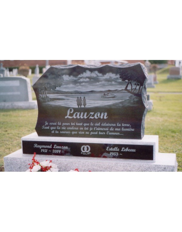 This funerary monument carved from high quality black granite with a polished facade and bumpy sides is presented to you on 2 granite bases instead of dune. This funerary monument features a magnificent landscape representing a dream location by the lake.