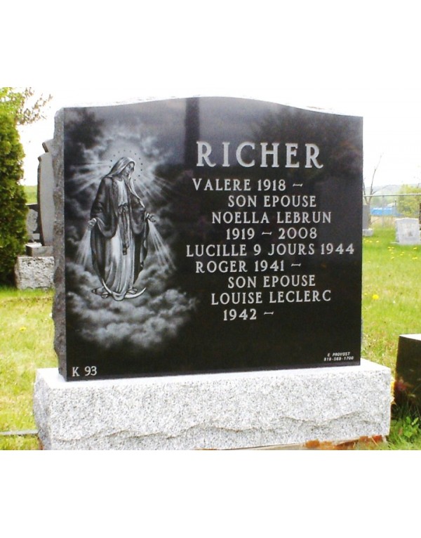 Ce monument funéraire taillé dans un granit de couleur noir, poli au devant et bosselé sur les côtés, vous est offert avec une somptueuse gravure faite à la main de la sainte-vierge veillant sur vous et lêtre cher.