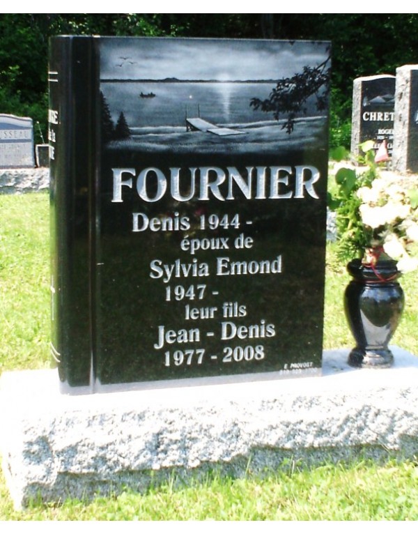 This funerary monument is presented to you in a form representing a book that of life. On the front, the artist engraved a sumptuous landscape of a lake at sunset. This monument is offered in black granite and is polished on all of these surfaces.