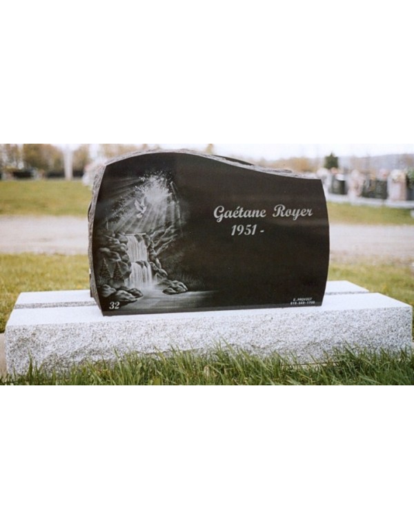 This funerary monument is cut for you in a magnificent granite of color of first quality, its somewhat unusual shape, as well as its surface polished at the front offers you a wonderful landscape of fall, birds and nature. You will be captivated by the realism of this work of art.