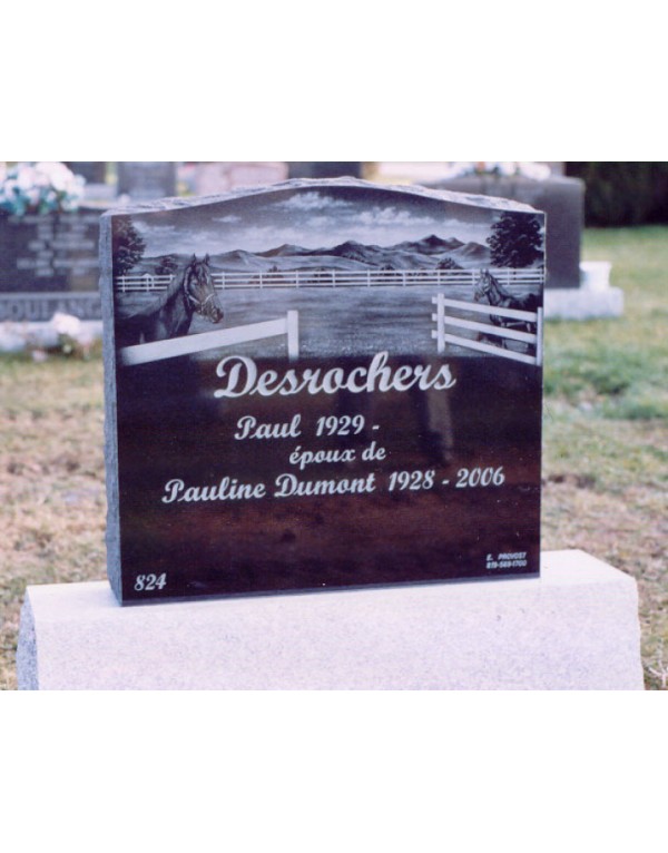 This funerary monument in the black color, offers you a magnificent scene of horses in the middle of nature, this engraving with a chisel is made on a surface which has been polished beforehand and we have preserved the edges of the funeral monument in the rough state in order to appreciate the splendor drawing.