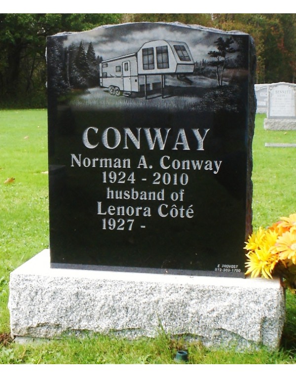 This funeral monument is all that is most unique, with its hand engraving representing a tent trailer this funeral monument is custom made for the loved one. Always offered in black color to maximize the contrast of the engraving and the monument its facade is polished and its sides are rustic.