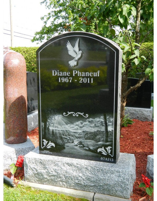 Very beautiful piece of black granite cut in an unconventional rounded shape but just as classic and tasteful. Engraving engraved by hand by an artist who makes this piece a unique monument in every way.